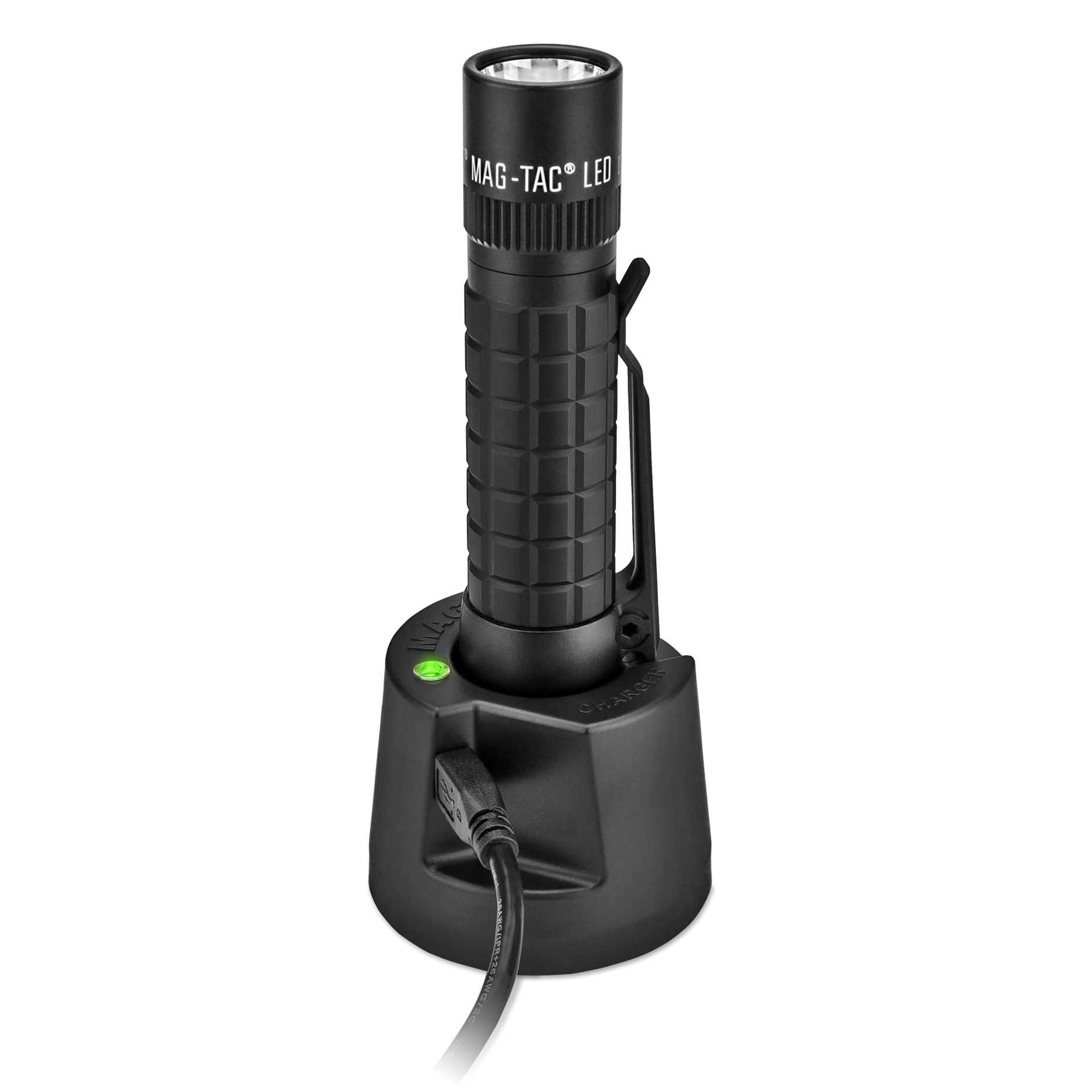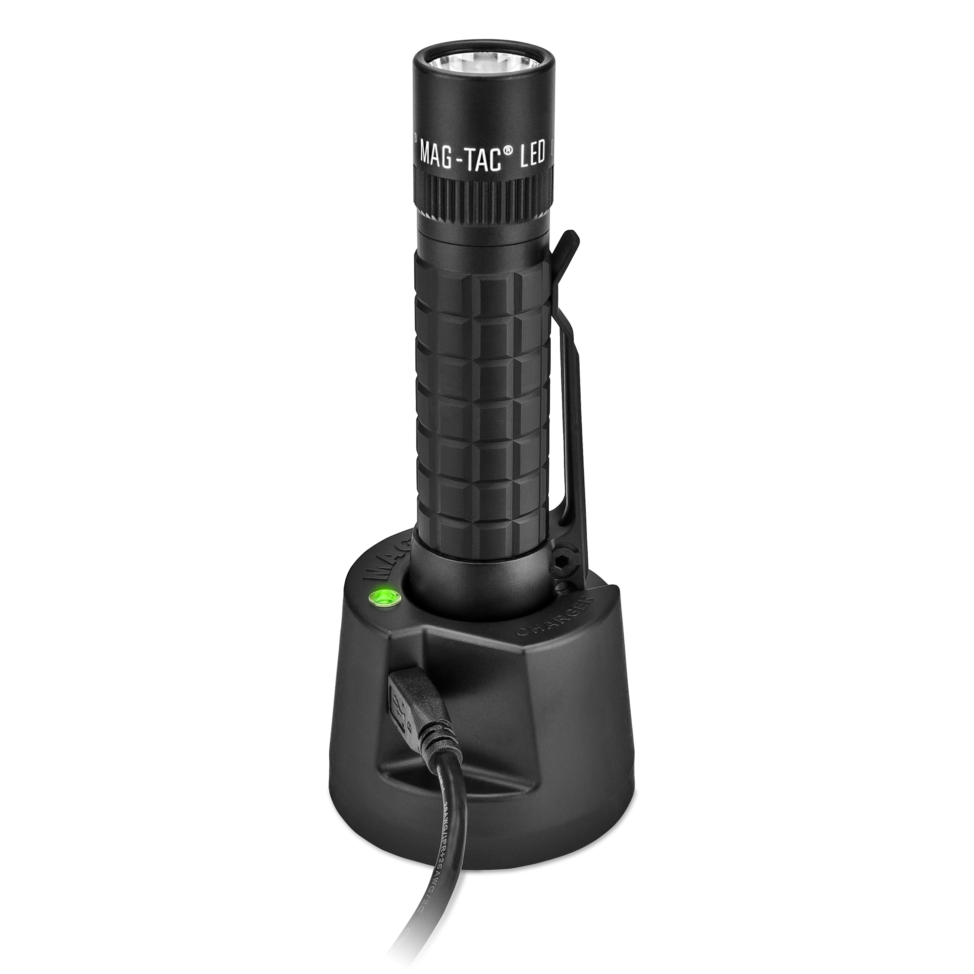 Maglite Mag-Tac II Plain is a rechargeable flashlight with a battery life of up to 2.5 hours. The flashlight comes with a removable pocket clip, and a USB-powered charging base. The charging base can be powered by the included 12V adapter or 120V converter, or any other charging source that complies with the USB 2.0 standard. In addition, there are 4 functions that can be selected via the Mag Instruments mode selector with the rear switch.